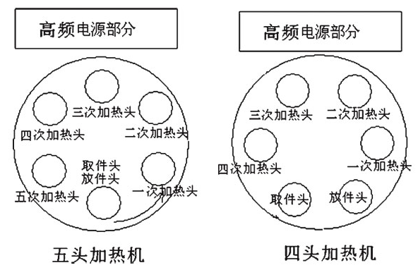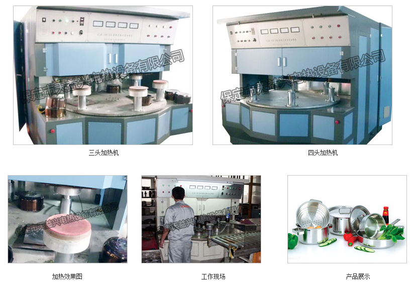 本設(shè)備采用旋轉(zhuǎn)式結(jié)構(gòu),鑄鋁轉(zhuǎn)盤上均勻分布6個(gè)工件支撐頭,轉(zhuǎn)盤每次轉(zhuǎn)60度角;氣動(dòng)升降;安裝四個(gè)或五個(gè)感應(yīng)頭同時(shí)加熱、每個(gè)鍋底均經(jīng)四到五次加熱。